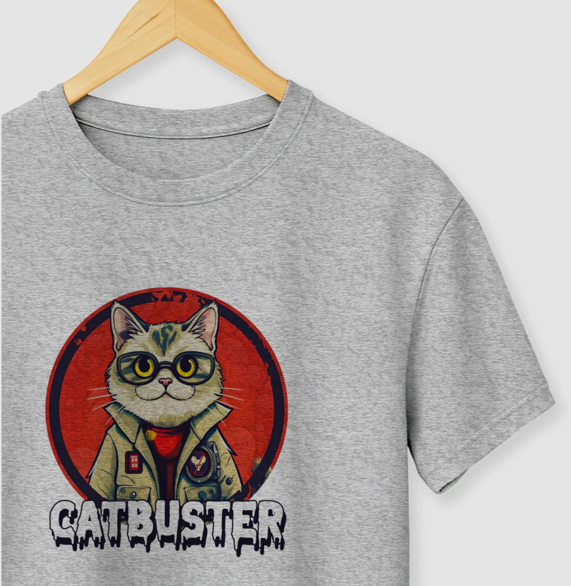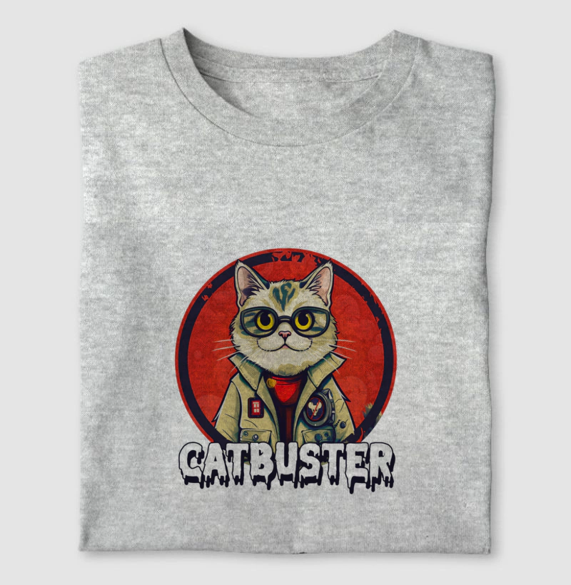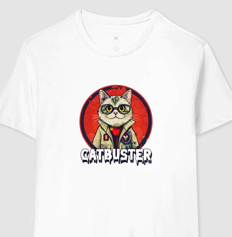 Inspirada no clássico Ghostbusters, essa estampa é uma versão felina da equipe mais destemida do cinema — mas aqui, o fantasma é substituído por um gato.