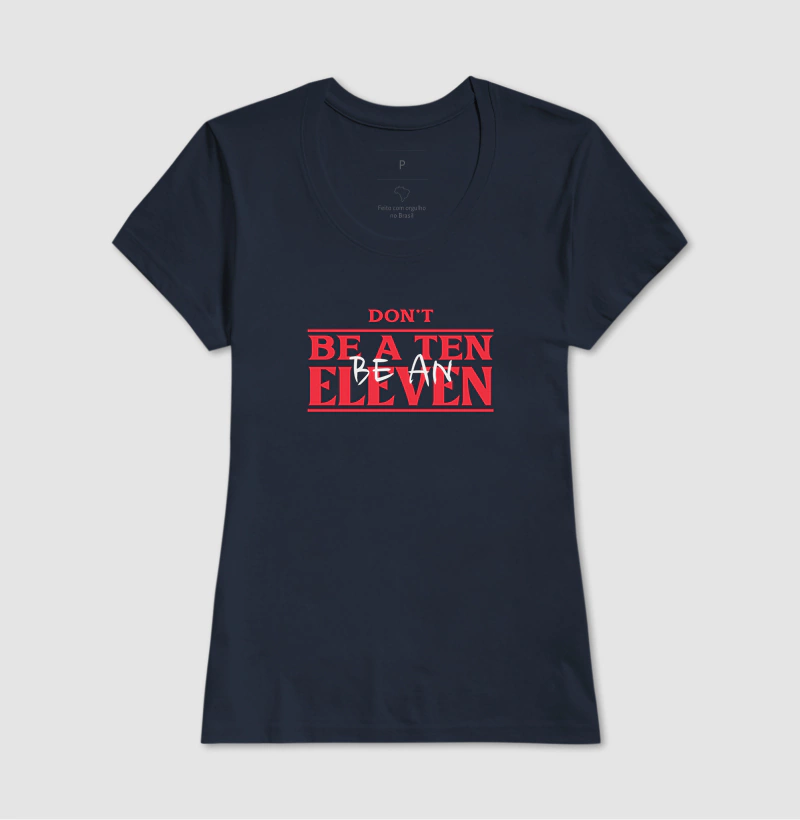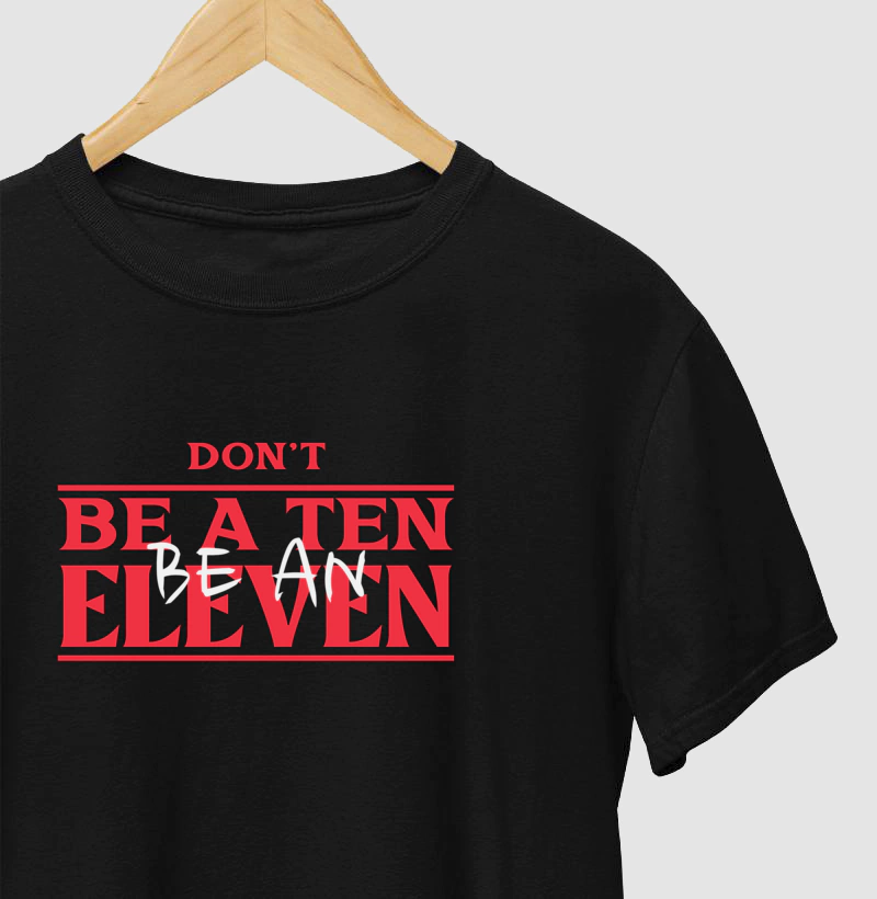 Se você acredita que ser apenas um 10 não é suficiente, essa camiseta foi feita para você! Inspirada na icônica personagem Eleven, de Stranger Things, essa peça é perfeita para fãs da série, cultura pop e quem busca sempre ultrapassar os limites.