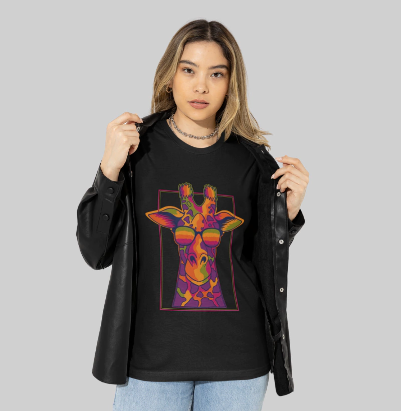 🎨 Estampa artística e original: Uma girafa com manchas que parecem pinceladas de tinta — mistura de pop art com mood tropical.