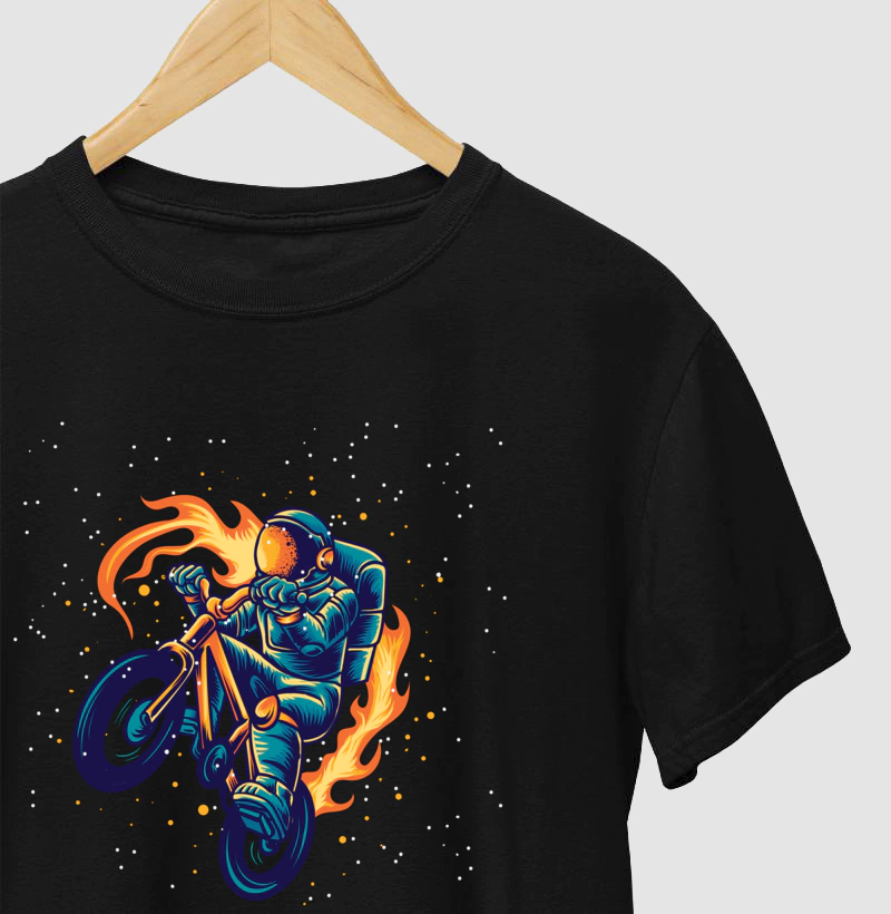 Essa estampa é a definição perfeita de liberdade em dois níveis: sobre duas rodas e entre as estrelas. Ideal pra quem ama motocicletas, cultura sci-fi e uma boa mistura de viagem interestelar com atitude de estrada.