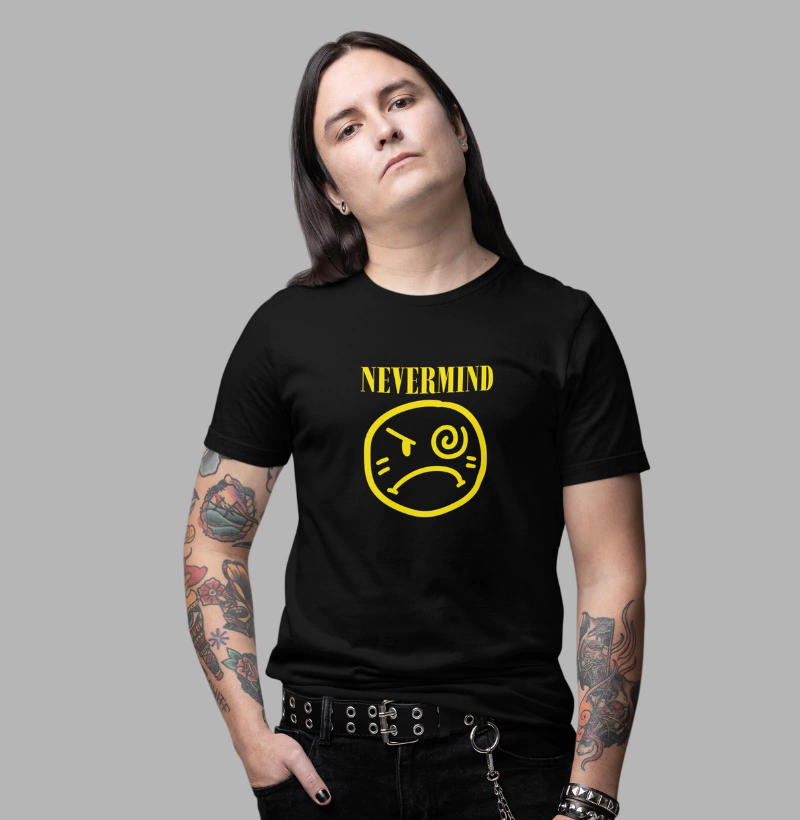 Inspirada no emblemático álbum da banda Nirvana, "Nevermind", essa camiseta é para quem vive a rebeldia, a energia do grunge e o legado de Kurt Cobain. Uma verdadeira homenagem a uma das fases mais icônicas da música dos anos 90, com um toque moderno e irreverente.