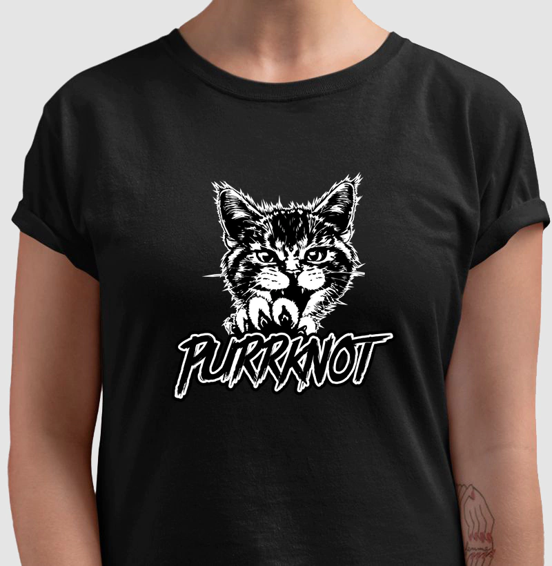 Um jogo de palavras entre “purr” (ronronar) e “knot” (nó), essa camiseta é para quem se sente um pouco confuso, muito fofo e totalmente estiloso. “Purrknot” é o estado mental felino de quem vive se enroscando nos próprios pensamentos — e ainda sai com charme.